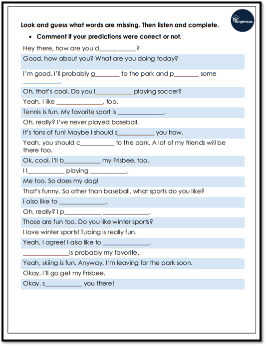 2.- Look at the following conversation script about sports and guess the missing words.
